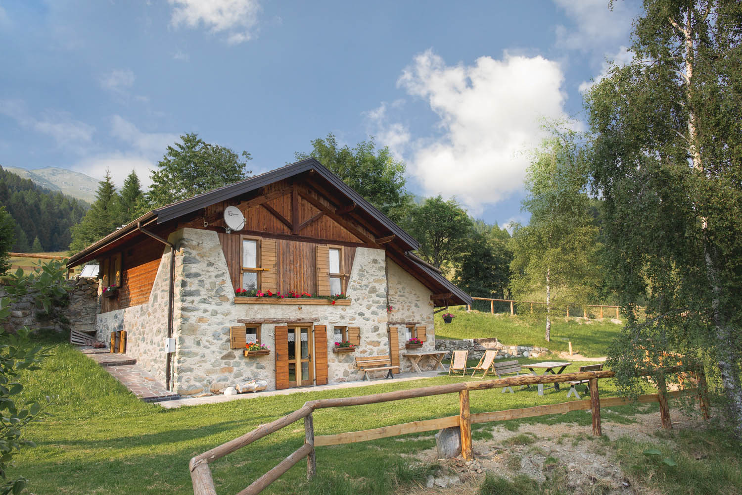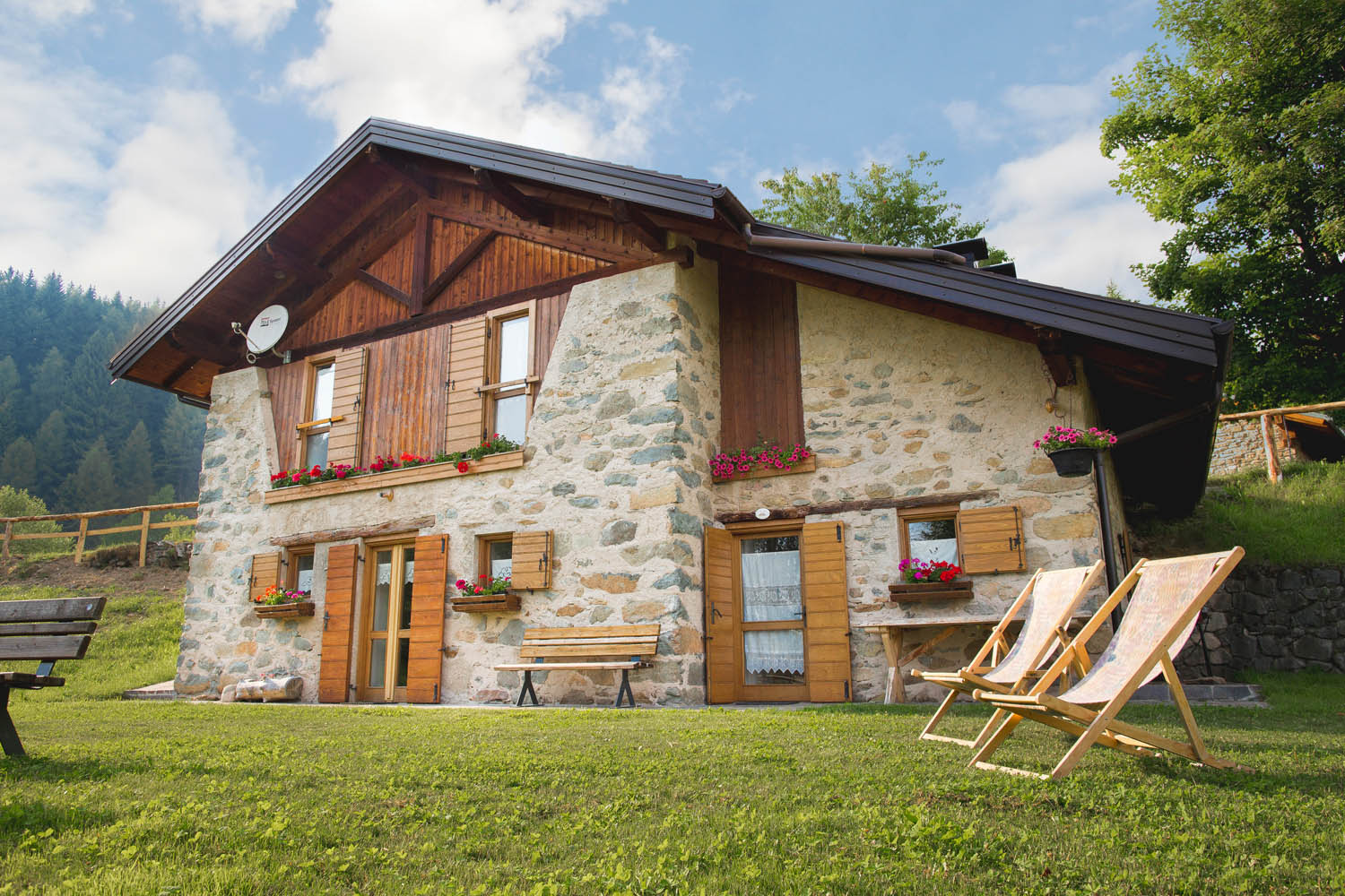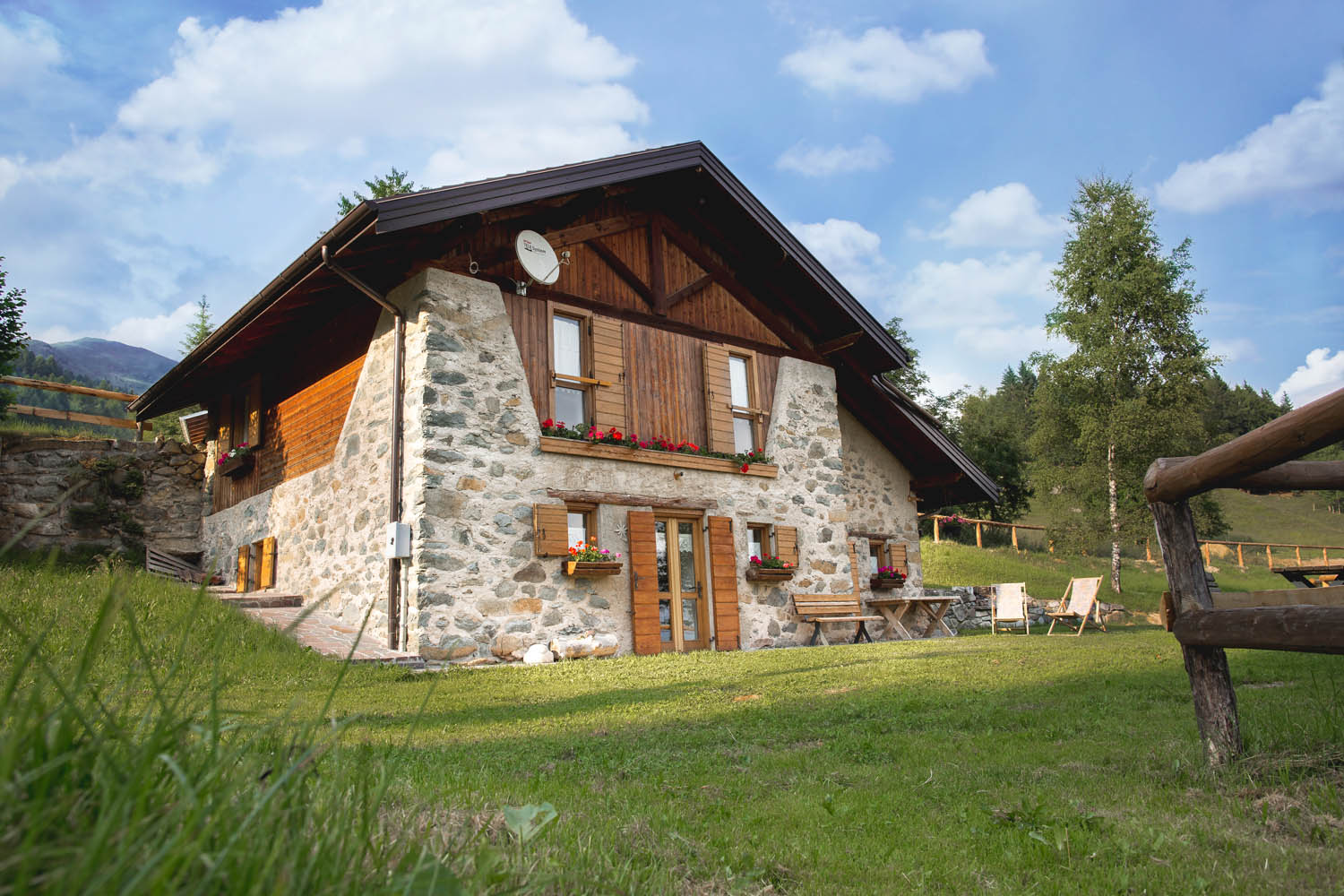 CARATTERISTICHE: Tipica costruzione di montagna in sassi e legno disposta su due piani. Al piano terra ampio soggiorno dotato di caminetto e TV; cucina con angolo cottura, stufa a legna, forno; bagno e camera singola. Al primo piano 3 camere: 1 quadrupla, 1 tripla e una doppia, ciascuna dotata di bagno con doccia. Giardino con splendido ruscello, attrezzato con barbecue, sdraio e tavolo in legno. Diversi posti auto privati.
