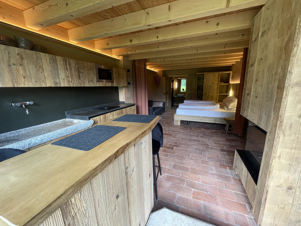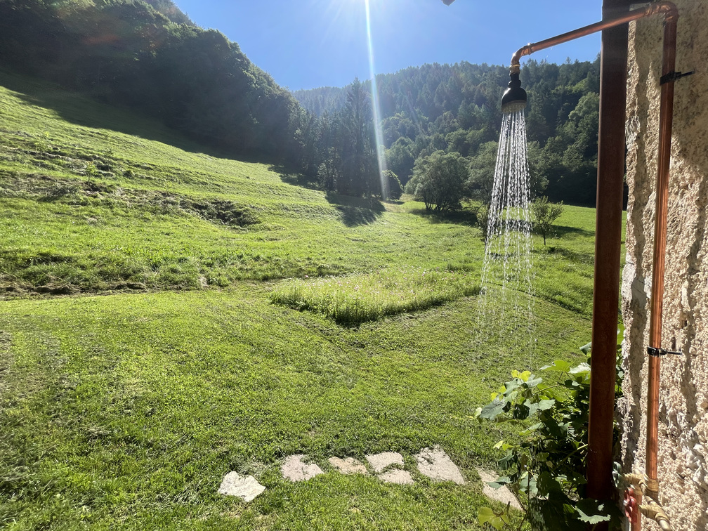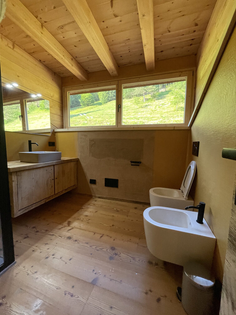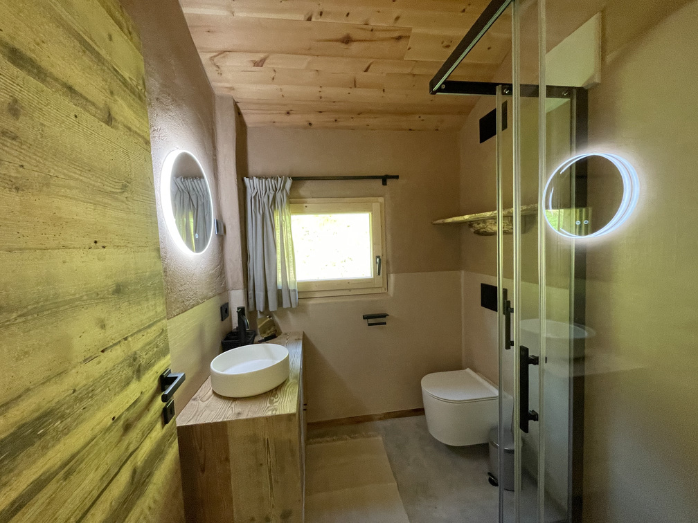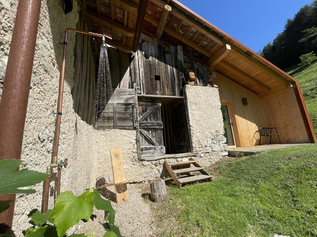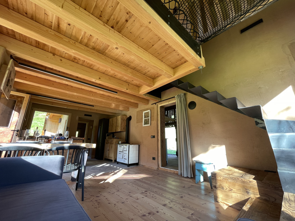 CARATTERISTICHE: fienile alpino rinnovato con tecniche di bioedilizia al fine di garantire la massima salubrità interna. Argilla, calce naturale, pavimanti in cotto antico e legno Fiemme 3000. Legno di cirmolo per tetto e solai. Doccia calda-fredda esterna. Equipaggiato di tutti i comfort, termostati in ogni vano, ventilazione meccanica controllata, Cucine attrezzate con elettrodomestici Miele. Antica stufa economica e caminetto con fuoco a vista. Locale lavanderia. Barbecue e grande braciere. La parte antica del fienile è rimasta originale ed è adibita a spazio a disposizione dell’ospite.