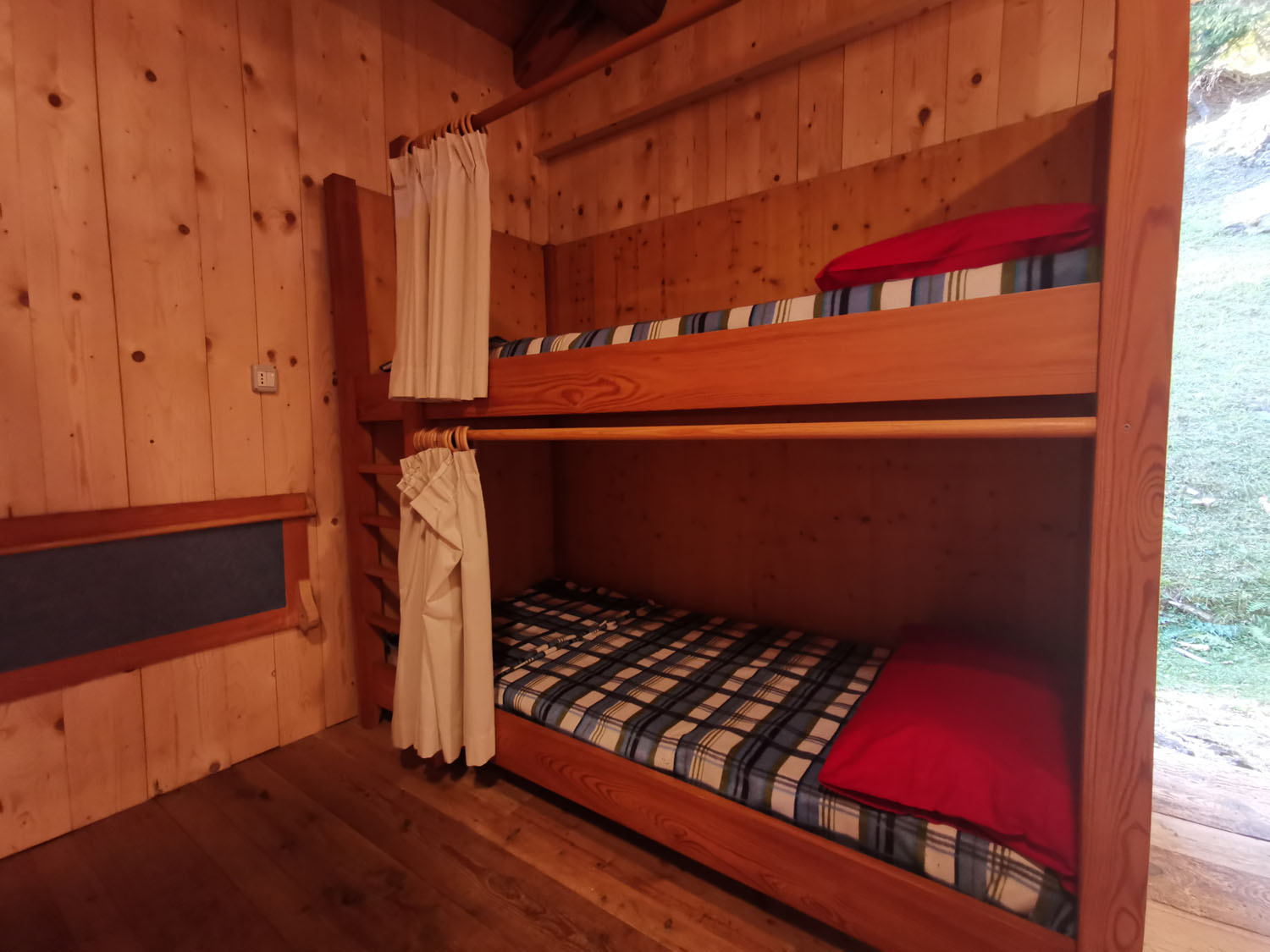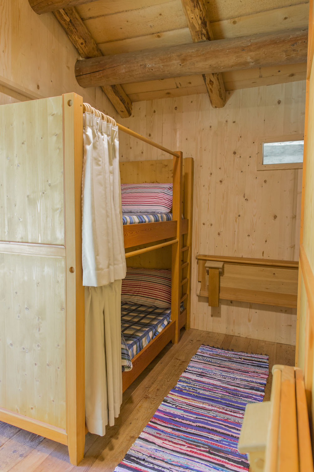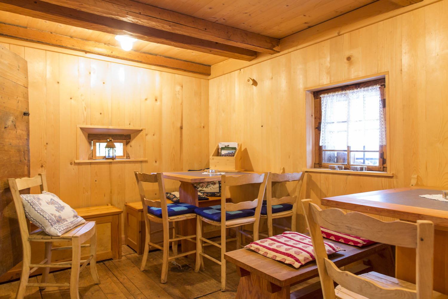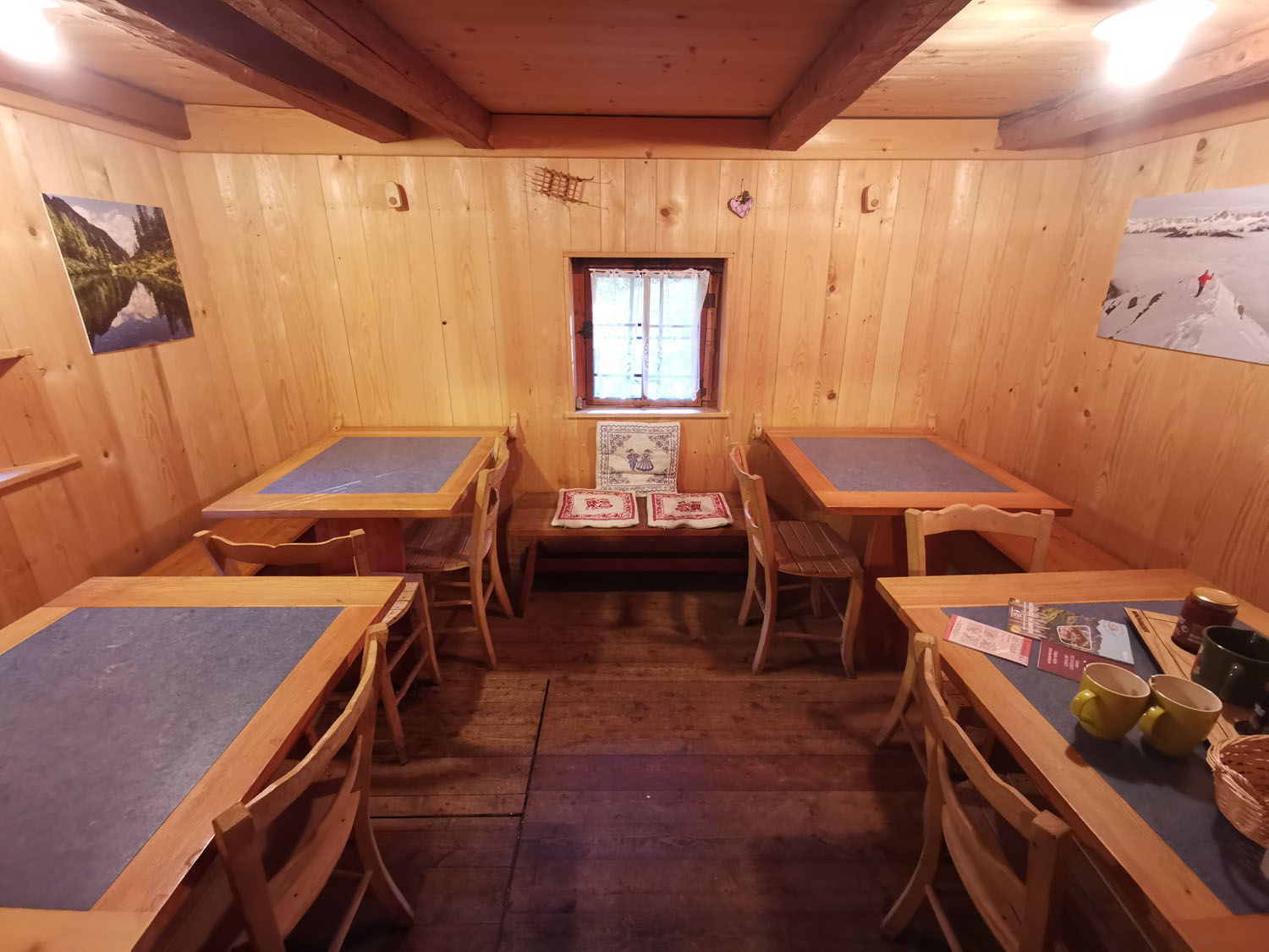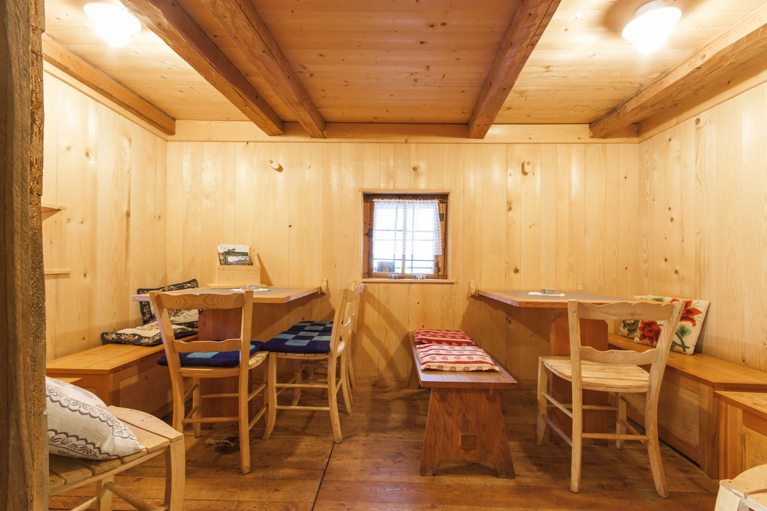 CARATTERISTICHE: Il nucleo di Pra’ dei Tassi è composto da due edifici rurali con i tratti caratteristici delle costruzioni in legno tradizionali con incastro block-bau e copertura a scandole. L’ unità più piccola, la casera, è dotata di servizi igienici, con lavandino e water, un piccolo cucinotto con lavandino e una credenza dove si trovano le stoviglie necessarie (piatti, bicchieri, posate, pentole). Nel primo vano, al quale si accede dall’ingresso, trovano spazio una stufa a legna, una cucina a gas, un mobile per riporre i cibi , e una scafa l’antica vetrina della casera. Nella stanza adiacente quattro tavoli rialzabili con sedie e panche costituiscono la zona pranzo. Il tabià (fienile) ospita la zona notte con, al piano terra, docce e servizi igienici (water, turca) lavandini con acqua calda e possibilità di usare alcuni pannelli elettrici per riscaldare i locali in caso di mal tempo; al piano di sopra, si trovano dodici cuccette con materasso e cuscini. Sistemazione ideale in sacco a pelo, in alternativa con coperte e lenzuola, non in dotazione. Non è assicurata la copertura della telefonia mobile nei pressi della baita.