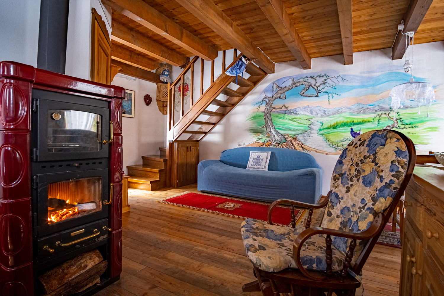 SERVIZI: Piano Terra: Open Space con soggiorno-cucina, TV, stufa a legna Bagno completo: WC, Bidet, Lavabo, Doccia. Primo piano: Stanza Padronale, Stanza con 1 letto a castello e 1 letto singolo Presente una sauna esterna a legna a disposizione dell’ospite.